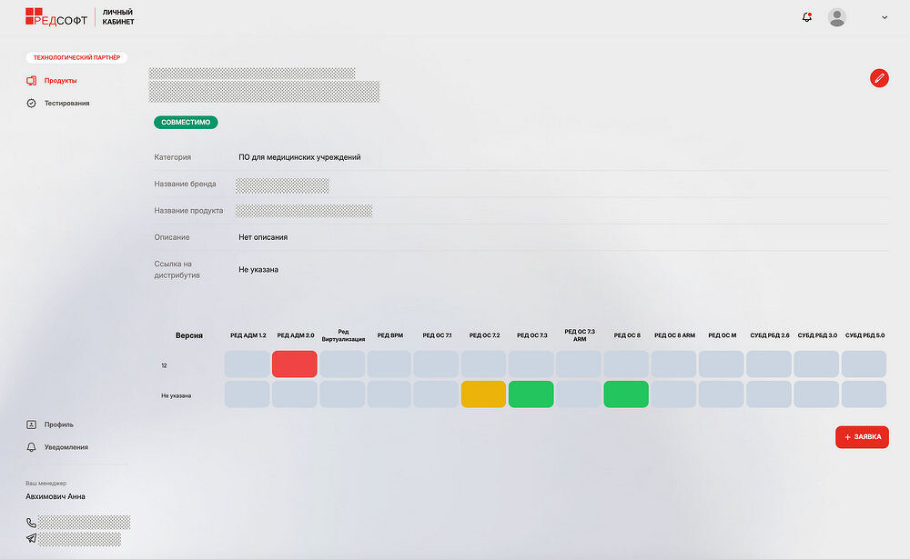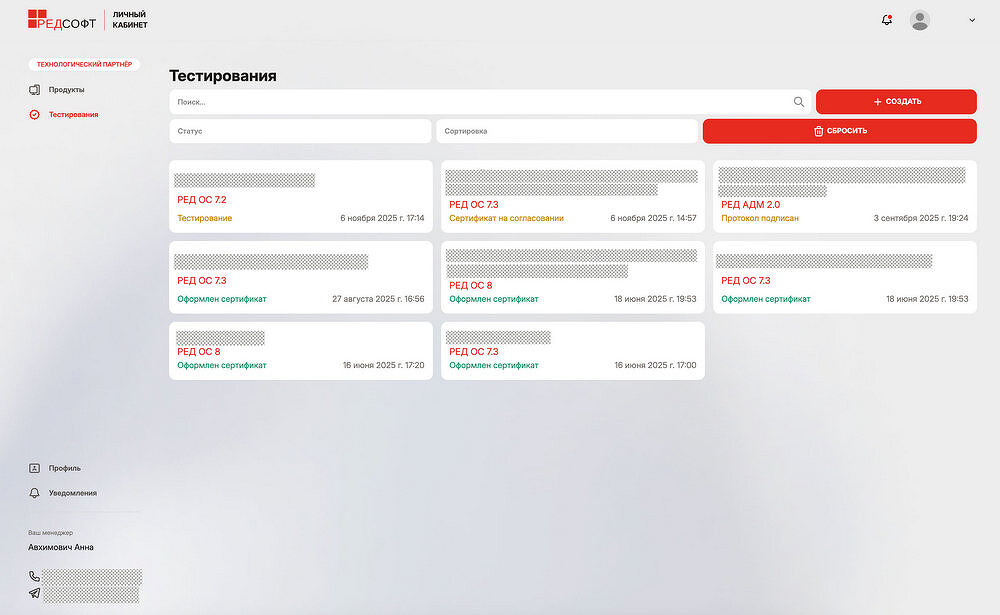 Теперь технологическим партнерам «Ред Софт» доступен личный кабинет, автоматизирующий процесс оформления документов: от заключения договора до генерации сертификата совместимости. Функционал личного кабинета помогает эффективно управлять процессами. Пользователь может самостоятельно создавать и редактировать карточки своих продуктов, инициировать заявки на проверку совместимости и отслеживать их статус. Также в личном кабинете хранятся протоколы проведенных тестирований и сертификаты совместимости.